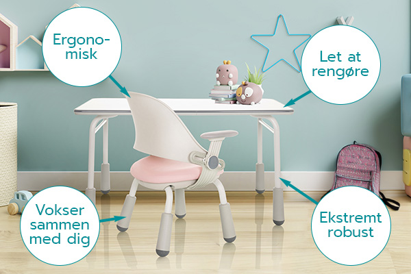 - Vokser med barnet takket være højdejusterbare bordben
